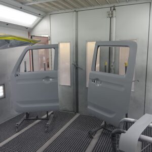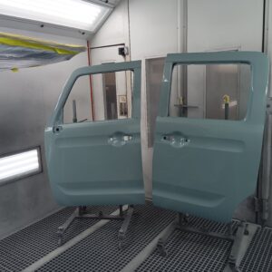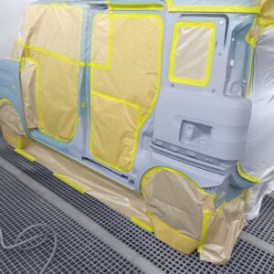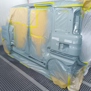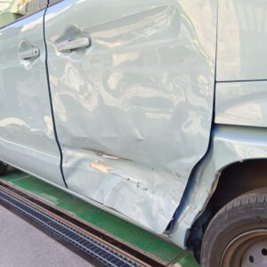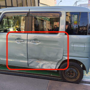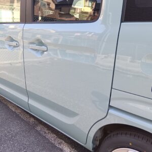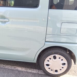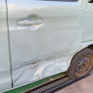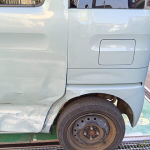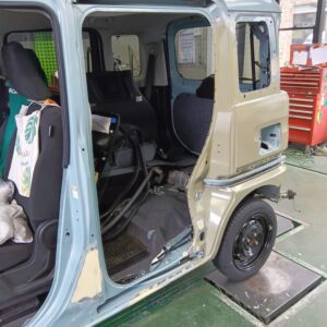 2026.02.26 スズキ スペーシア左側面大破修理 左前後ドア・クォーターパネル・タイヤ・ホイール交換です。 かなりひどく凹んでしまっています。 こうなると交換です。 新品前後ドアは下処理をして塗装を行います。 クォーターパネルは溶接されていますので、溶接をはがして外して 新品パネルを溶接して付けます。下処理をして塗装をします。 磨きをして完成です。 きれいになおりました。