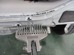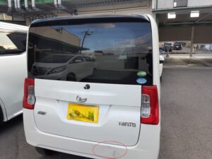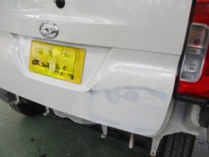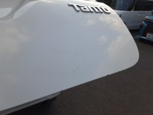 2026.02.20 ダイハツ タント リヤバンパ-・バックパネル・バックドア修理 右リヤバンパ-付近の傷修理です。 バンパーとバックドアの淵をぶつけています。 バンパーを外してみるとバックパネルが凹んでいました。 修正をします。 バンパーを修理します。 バックパネルも修正します。 バックドアはぶつけた時に押されていてゆがみがありましたので修正します。 塗装をします。 きれいに治りました!!